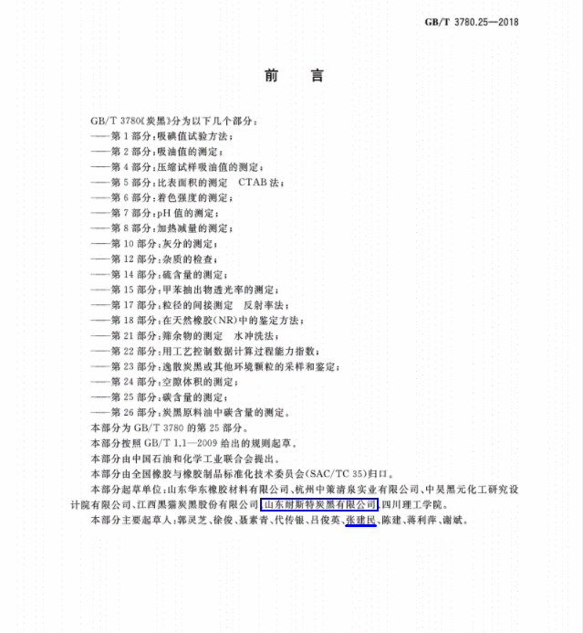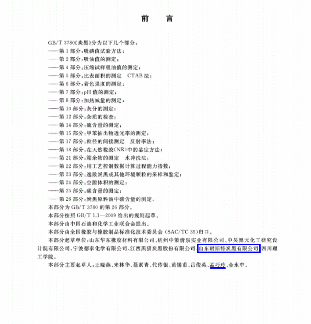 日前,从国家市场监督管理总局、中国国家标准化管理委员会获悉,山东耐斯特炭黑有限公司(以下简称“耐斯特炭黑公司”)主导起草的两项国家标准《炭黑第25部分:碳含量的测定》(GB/T3780.25-2018)和《炭黑第26部分:炭黑原料油中碳含量的测定》(GB/T3780.26-2018)于2019年正式颁布实施。