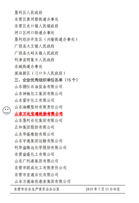 近日,东营市安委会对2019年度全市安全生产月活动开展情况进行了通报,万达宝通轮胎榜上有名,被评为企业优秀组织单位。