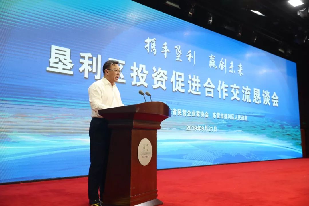 东营市副市长冯艺东在致辞中表示东营市委、东营市人民政府将一如既往的支持民营企业发展,全力以赴为企业发展提供一流服务、营造一流环境、做好一流保障,推动东营市及垦利区与省民营企业家协会互惠互利、共谋发展、合作共赢,热烈欢迎各位企业家来东营来垦利投资兴业。