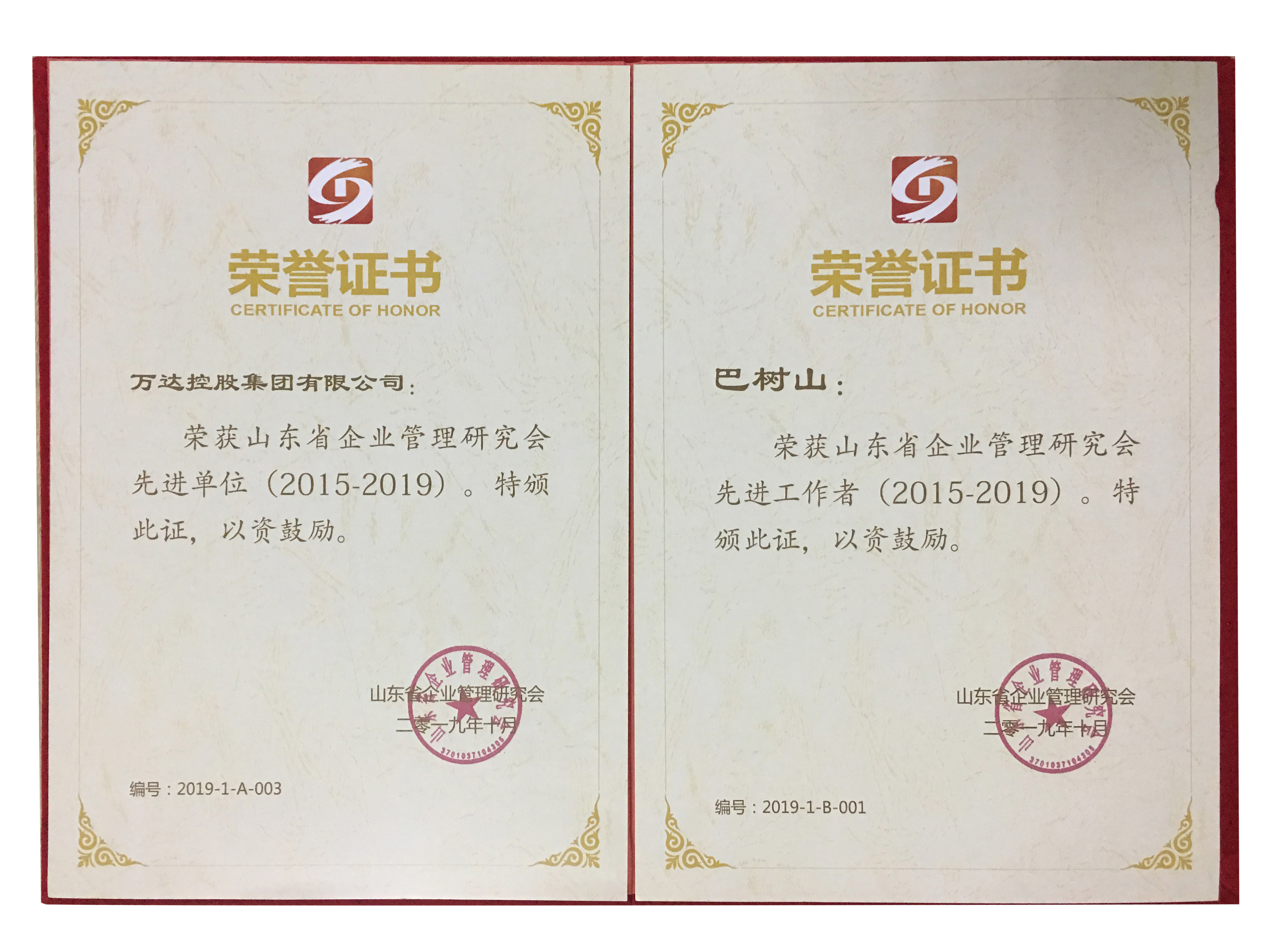 会上,万达集团荣获“山东省企业管理研究会先进单位”称号、巴树山荣获“山东省企业管理研究会先进工作者”称号。