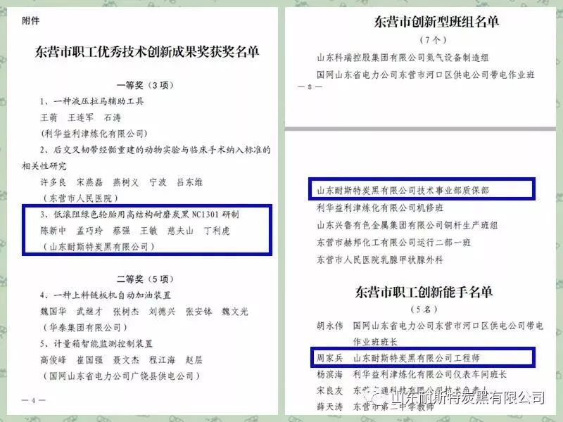 日前,东营市总工会、科学技术局、人力资源和社会保障局、经济和信息化委员会联合下发了《关于2019年度东营市职工优秀技术创新成果获奖情况和东营市职工技术创新竞赛示范企业、创新型班组、创新能手选树情况的通报》,耐斯特炭黑公司榜上有名,并凭借技术创新成果《低滚阻绿色轮胎用高结构耐磨炭黑NC1301研制》获“东营市职工优秀技术创新成果一等奖”,公司质保部,陈新中、周家兵分别荣获“东营市创新型班组”、“东营市五一劳动奖章”和“东营市职工创新能手”。以上荣誉的取得,是政府对公司在推动企业技术创新发展、促进企业技术进步和企业技术创新管理方面取得成绩的认可。