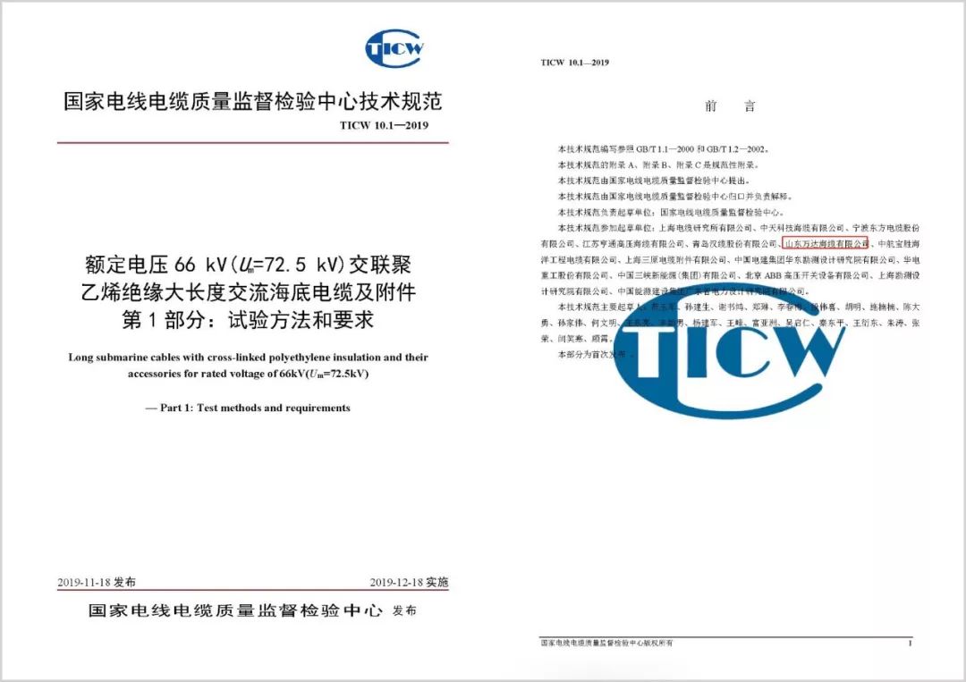 近日,从国家电线电缆质量监督检验中心获悉,万达海缆公司参与起草的《额定电压66kV(Um=72.5kV)交联聚乙烯绝缘大长度交流海底电缆及附件》(TICW 10.1~10.3-2019)将于2019年12月开始实施。万达海缆公司专业致力于高端线缆的研发制造,公司先后成功研制220kV、110kV、66kV等高电压等级、大截面含软接头海缆,均已获得权威机构颁布的第三方型式试验报告。其中自主研发的220kV 3×1000mm2海缆荣获“2019年中国风电产业50强十佳优秀产品奖”、“东营市高价值专利二等奖”等荣誉,阻水耐腐蚀型海缆新产品成功通过了市科技局科技成果评价认证,企业核心竞争力得到持续增强。