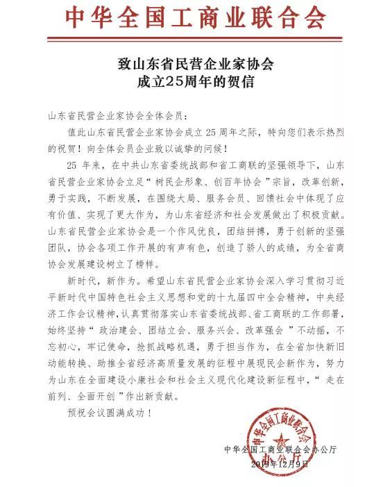 宣读全国工商联致山东省民营企业家协会成立25周年贺信