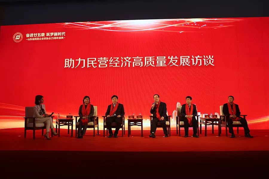 随后,举行了“助力民营经济高质量发展”高端访谈,省委统战部副部长、省工商联党组书记、常务副主席周云平同志,山东大学新闻传播学院党委书记、管理学教授、博士生导师王德胜同志,山东省工商联副主席、省民营企业家协会会长、万达集团党委书记、董事局主席尚吉永同志,山东太阳纸业副董事长、协会常务副会长李娜女士,北京金城同达律师事务所济南所主任、协会监事长、省民营经济法律服务团副团长刘坚勇同志接受主持人采访,畅谈助推民营企业高质量发展的观点,并与参会人员进行交流互动。