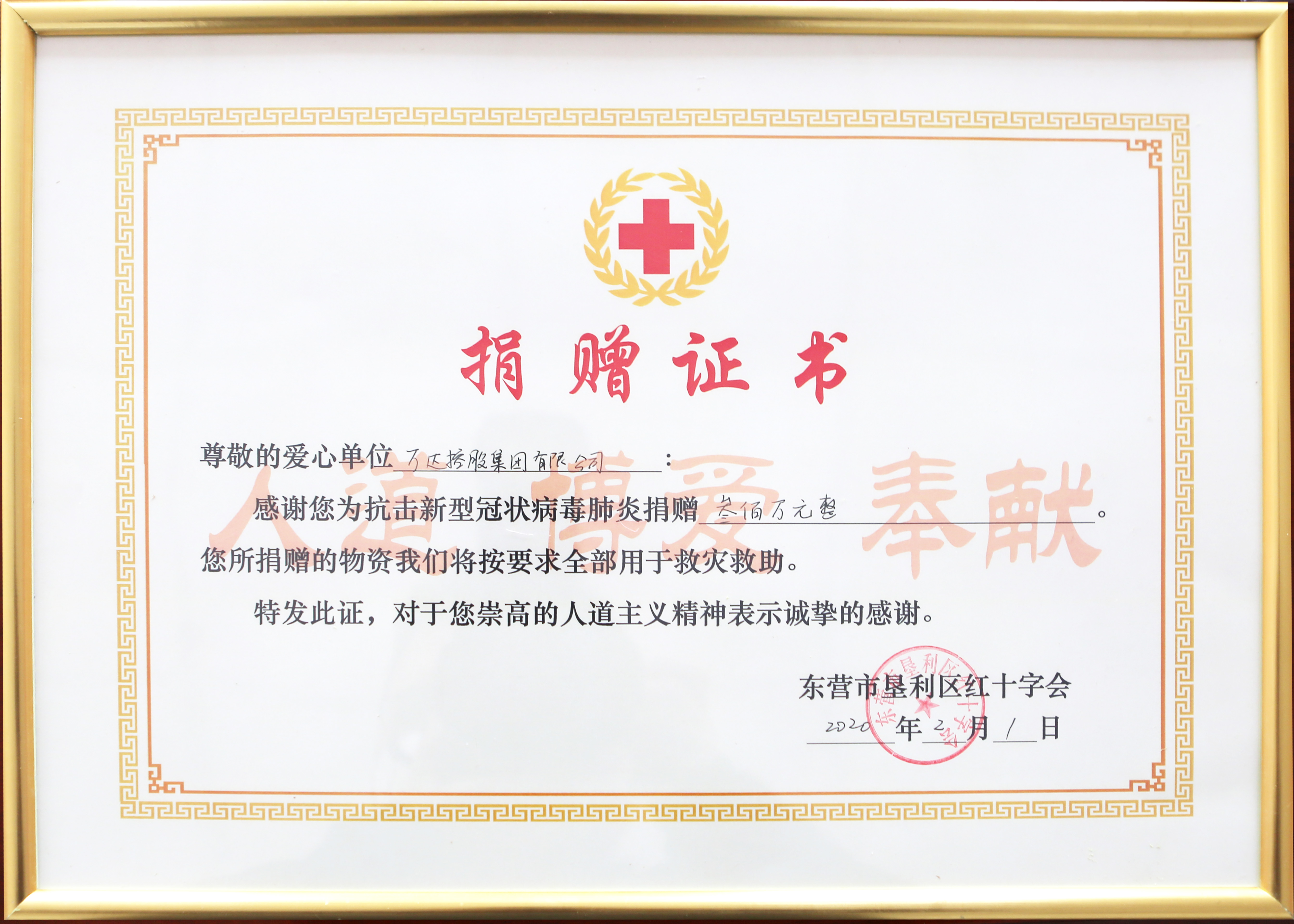 垦利区红十字会常务副会长张文莲与万达集团轮值执行总裁巴洪社进行捐赠款交接