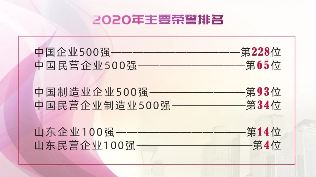 ■集团公司党委书记、董事局主席尚吉永参加省委书记刘家义召开的谋划“十四五”发展座谈会,并代表企业家建言献策;参加省长李干杰召开的全省领军民营企业座谈会暨山东省“十强”产业民营企业10强发布会。■集团公司党委书记、董事局主席尚吉永出席2020全国“万企帮万村”精准扶贫行动论坛并作大会发言。■集团公司党委书记、董事局主席尚吉永增选为全国工商联十二届执行委员会委员,当选全国工商联石油业商会常务会长、省会经济圈商会合作发展联盟轮值主席。■中国光彩会副会长、集团公司党委书记、董事局主席尚吉永荣获由中国光彩事业促进会颁发的“光彩事业发起实施25周年”纪念章。■万达集团荣获“全国工商联抗击新冠肺炎疫情先进民营企业”“2020山东社会责任企业”“山东省企业设备管理优秀单位”“东营市百企帮百村精准扶贫行动先进集体”“东营市工商联东西部扶贫协作和对口支援先进集体”“东营市工商联抗击新冠肺炎疫情先进集体”“垦利区突出贡献企业”“山东省企业管理研究会2020年度优秀会员单位(扶贫爱心企业)”等称号。■万达集团荣获“山东省企业文化建设先进单位”称号并入选2020年度新时代企业文化引领高质量发展标杆企业,党建案例荣获二等奖。■万达集团党委荣获“东营市抗击新冠肺炎疫情先进集体”和“东营市先进基层党组织”称号。■万达集团上榜山东省民营企业品牌价值百强,位列高端化工产业品牌价值十强第2位。■万达集团精益管理成果荣获“2020中国企业改革发展优秀成果奖”与“山东省企业管理研究会2020年年会论文”一等奖。■万达集团荣获第五届中国设备管理大会“设备管理标准化标杆企业”和“经典案例示范单位”称号。■山东省贸促会、山东国际商会授予万达集团“第六届主席团成员单位”。