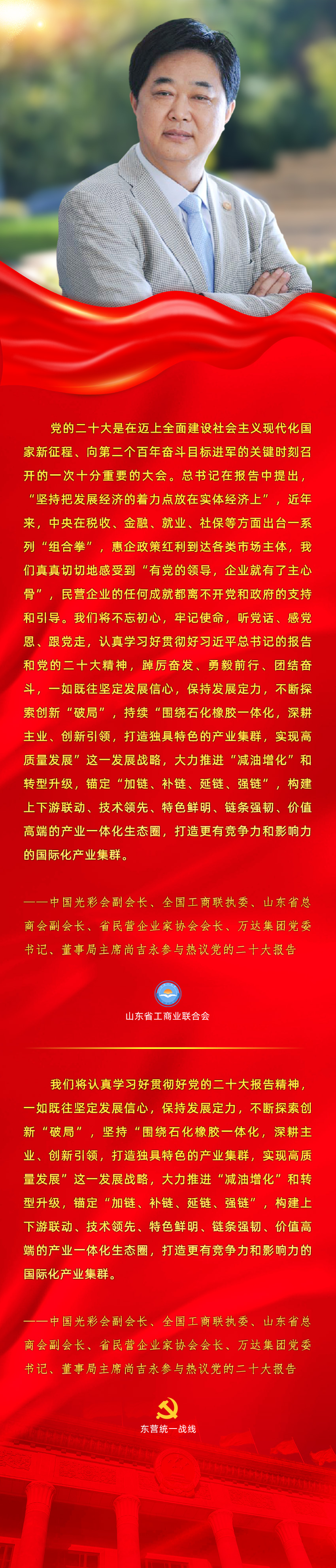 山东省总商会副会长、山东省民营企业家协会会长、万达集团党委书记、董事局主席尚吉永参与热议党的二十大报告