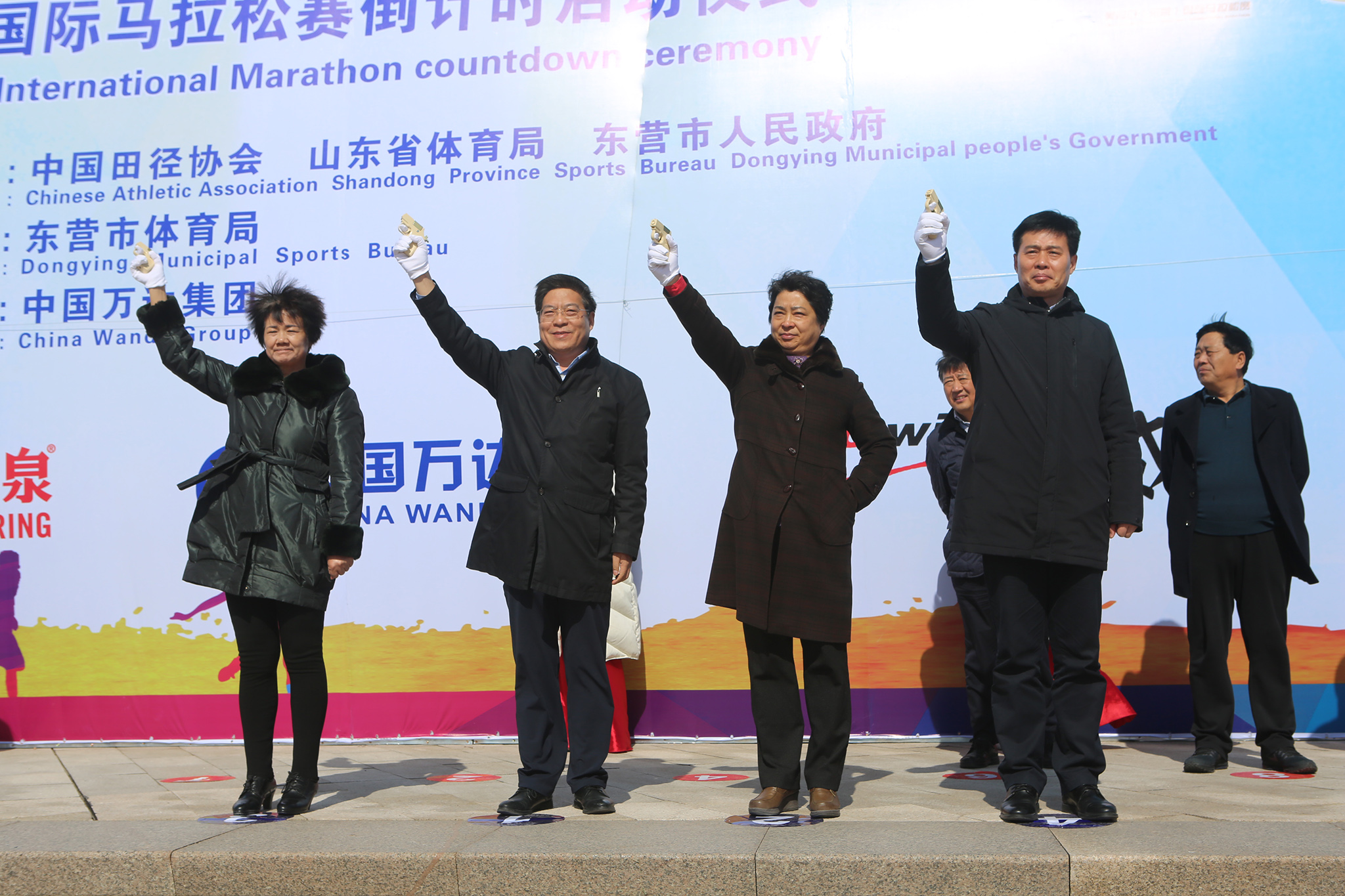 李永元、刘美华、张敏、尚建立共同为马拉松热身赛鸣枪发令。