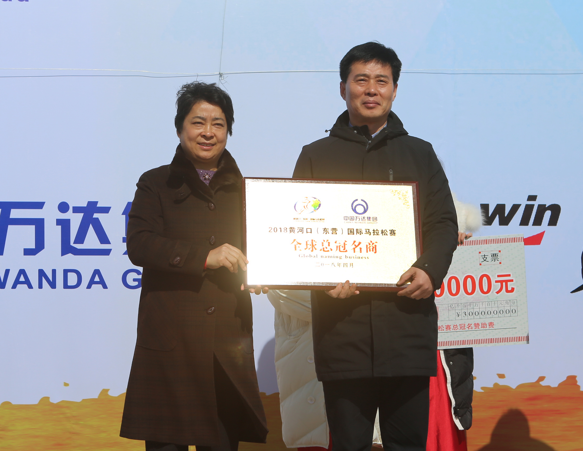 市政府副市长刘美华授予中国万达集团“2018黄河口(东营)国际马拉松赛全球总冠名商”牌匾。