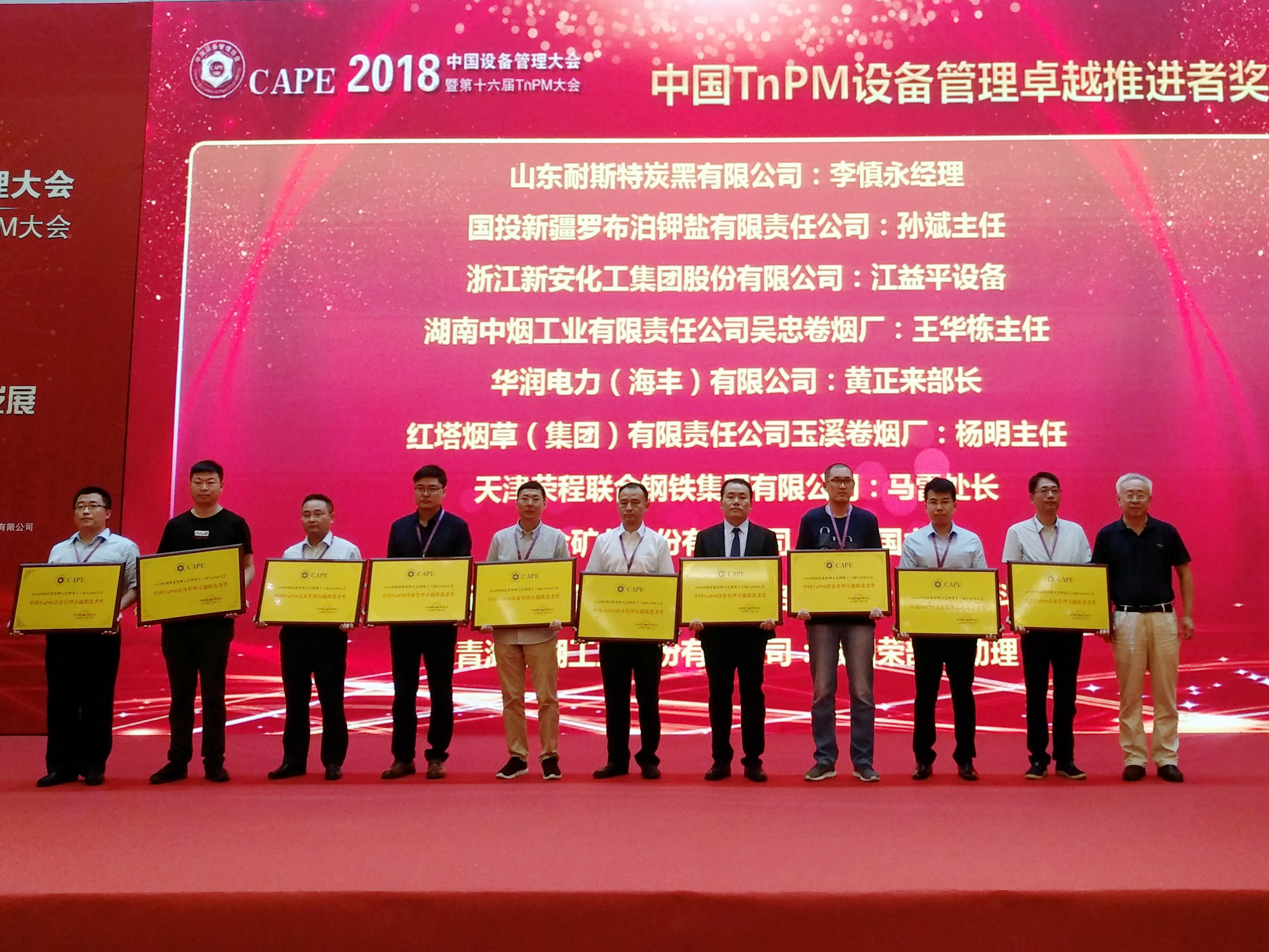 9月13日,由中国设备管理协会、国际维修联合会举办的2018中国设备管理大会暨第十六届TnPM大会在天津市隆重召开。山东耐斯特炭黑有限公司董事长王敏、万达集团总裁办总经理曲春林等应邀参加。大会公布了全国设备管理先进单位及个人名单。