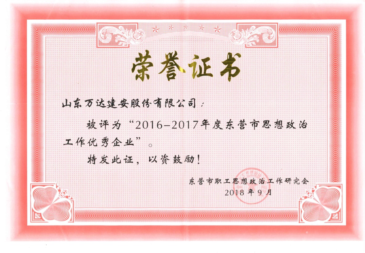 近日,东营市职工思想政治工作研究会印发了《关于表扬2016-2017年度东营市企业思想政治工作先进单位、先进个人和优秀研究成果的通报》。其中:山东万达建安股份有限公司被聘为“2016-2017年度东营市思想政治工作优秀企业”。