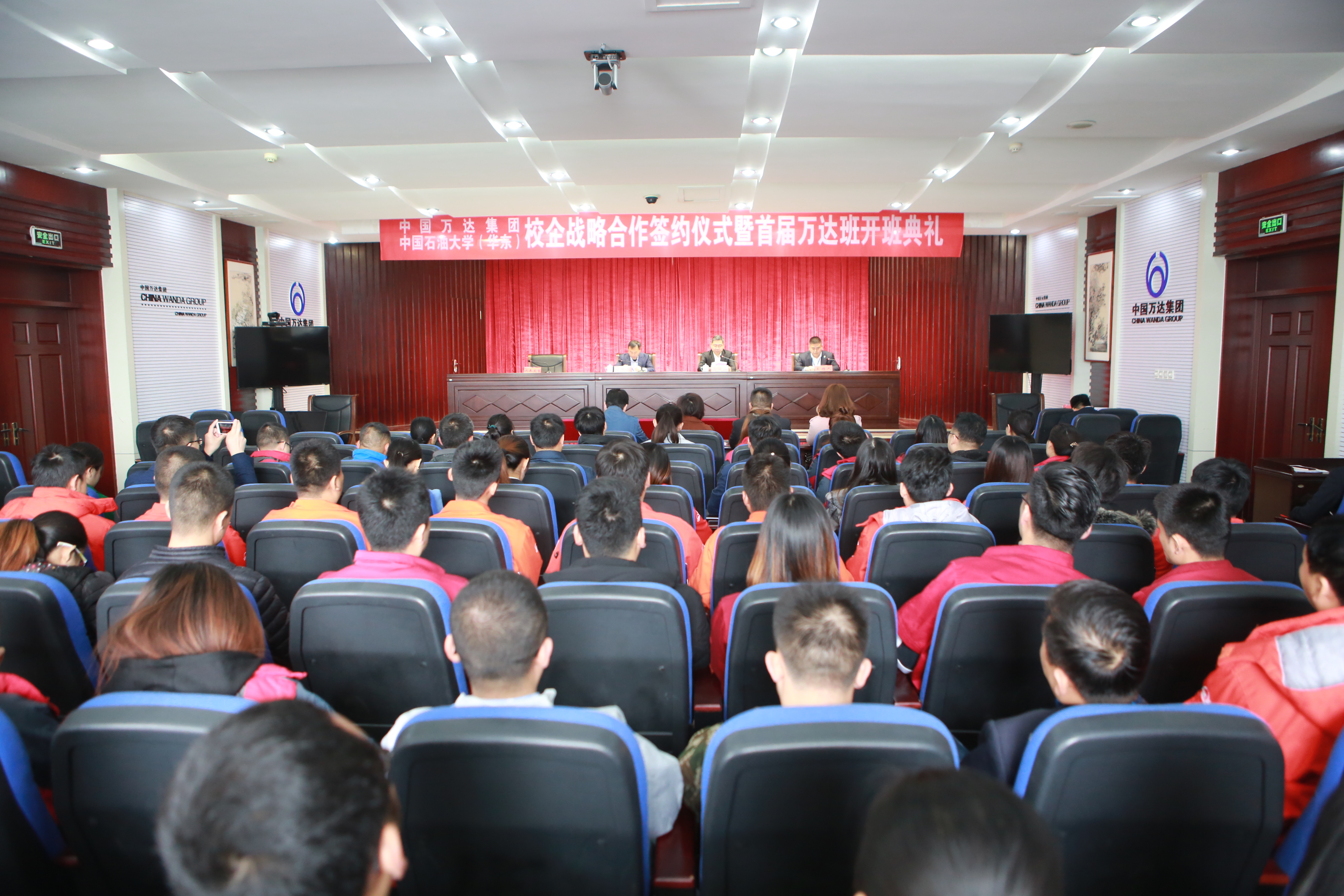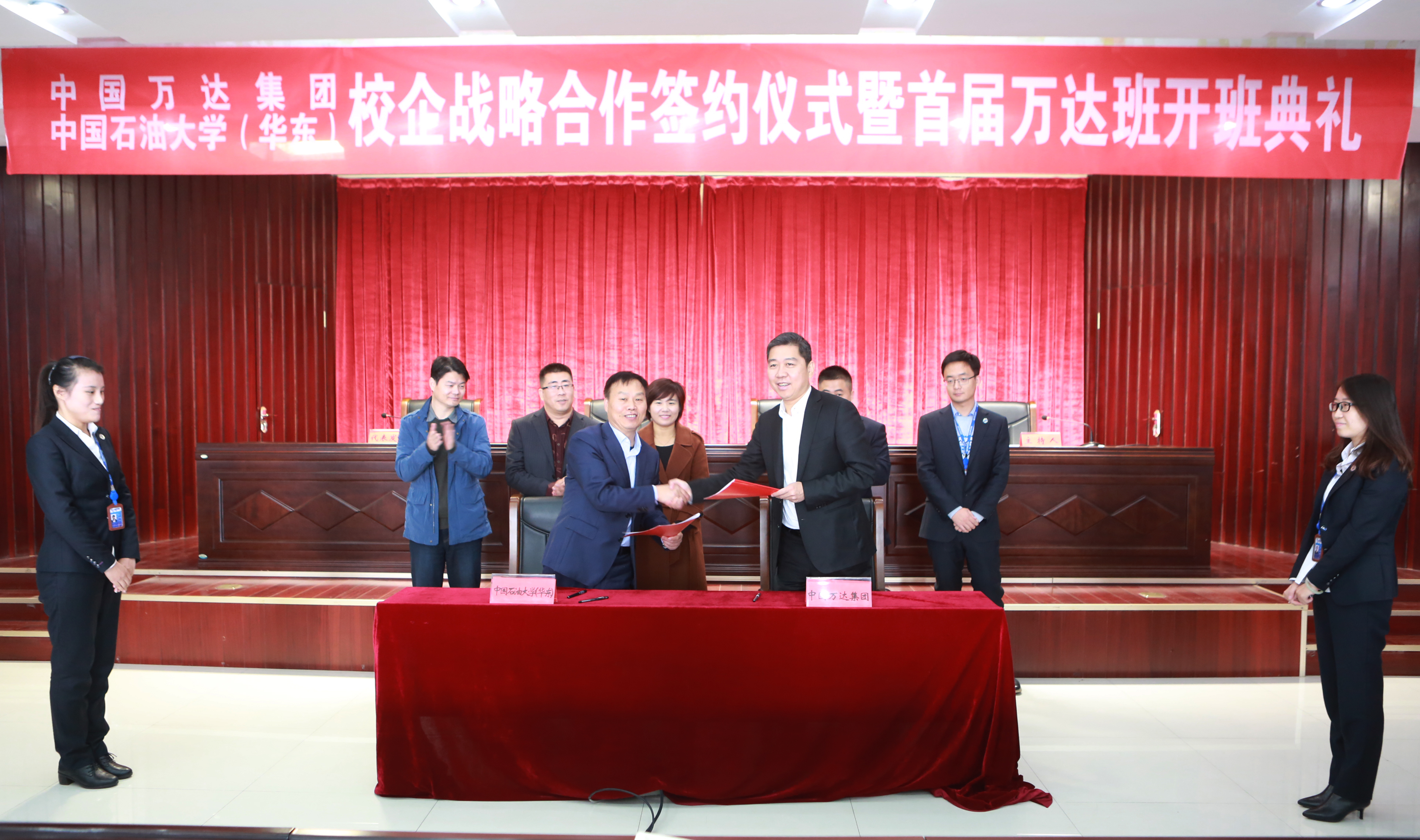 中国万达集团与中国石油大学合作(华东)继续教育学院开办成人教育学历提升万达班,并以此为契机,秉承“平等自愿、优势互补、互惠双赢、共同发展”的原则,围绕人才培养、师资支持、就业实训、学历提升、科研开发、在线教育等方面开展全面合作,签署校企战略合作协议。