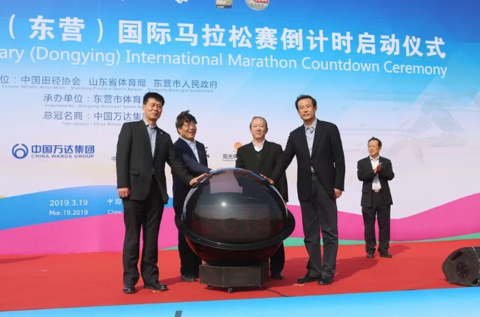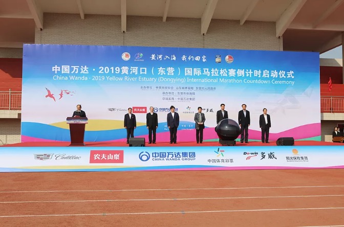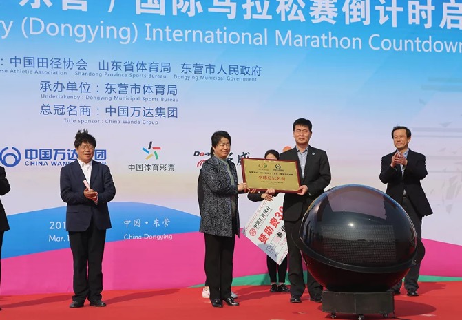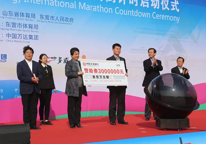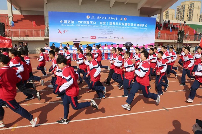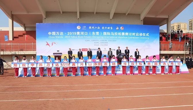 3月19 日上午9:30,中国万达·2019 黄河口(东营)国际马拉松赛倒计时启动仪式在东营市胜利第一中学举行。市人大常委会副主任李永元,市政府副市长刘美华,市政协副主席张义泉,中国万达集团董事局副主席、轮值执行总裁尚建立,以及市体育局、市胜利教育管理中心、市胜利一中有关负责同志参加启动仪式。市政府副市长刘美华同志授予中国万达集团“2019黄河口(东营)国际马拉松赛全球总冠名商”牌匾,中国万达集团董事局副主席、轮值执行总裁尚建立向刘美华副市长交付支票模型。