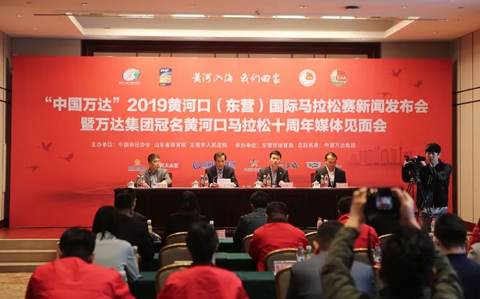 3月19日上午,“中国万达”2019黄河口(东营)国际马拉松赛新闻发布会暨万达集团冠名黄河口马拉松十周年媒体见面会东营宾馆综合楼中会议室召开,这是中国万达集团连续十年全球冠名赞助该项体育赛事。